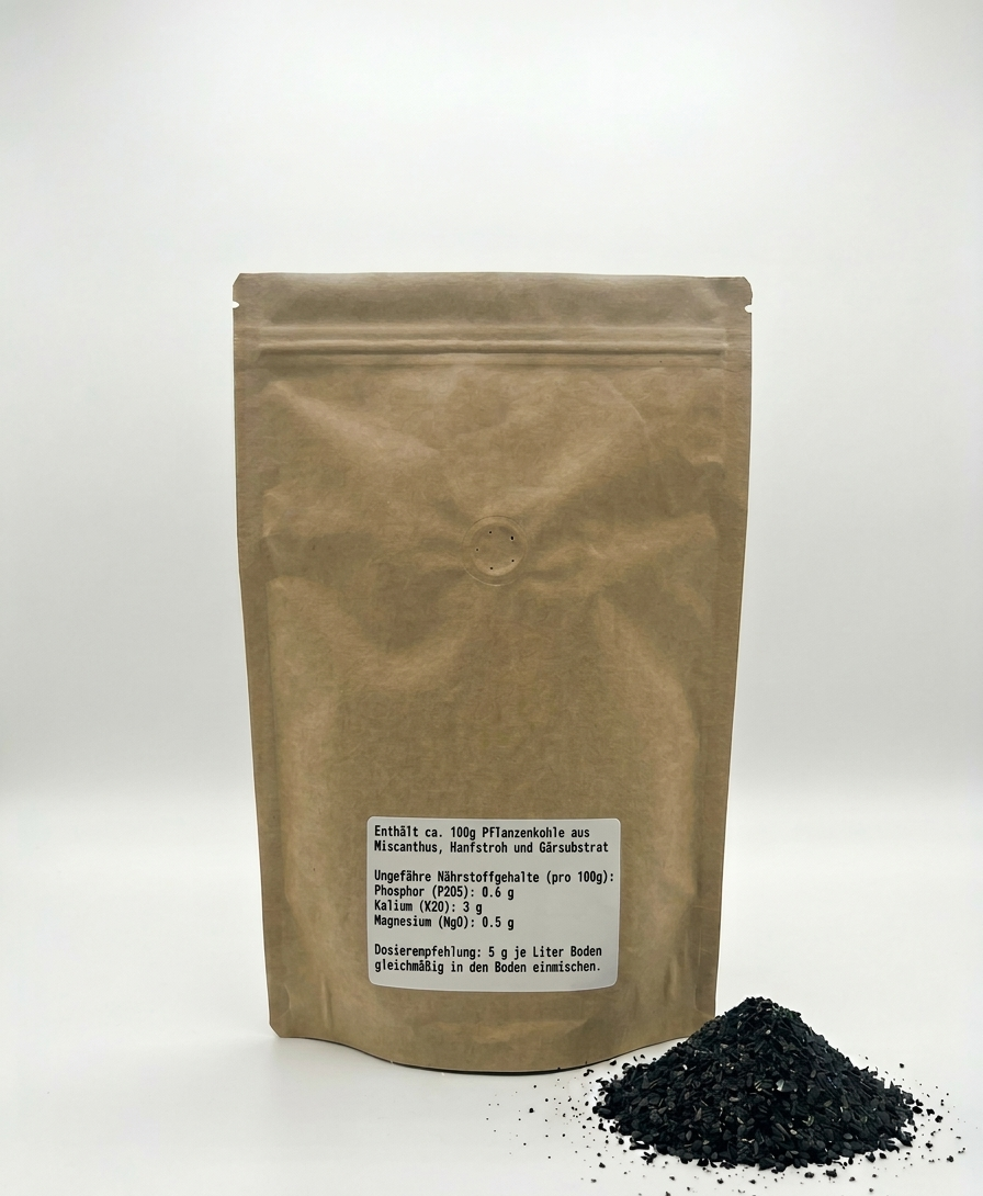 Pflanzenkohle Mischung Mineralienreiche Pflanzenkohle Mischung aus Miscanthus, Hanf und Gärsubstrat zur nachhaltigen Bodenverbesserung. Unterstützt die Nährstoff- und Wasserspeicherung sowie ein aktives Bodenleben. Nährstoffe je 100 g (ohne Gewähr): P₂O₅ 0,6 g | K₂O 3,0 g | MgO 0,5 g Dosierung: 5 g je Liter Boden gleichmäßig einmischen.